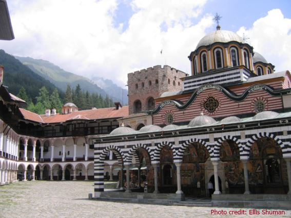 Rila Monastery. The most popular tourist site in the entire country is located about an hour and half’s drive south from Sofia. In a serene mountain setting, the monastery is named for Ivan Rilski, Bulgaria’s patron saint who lived in a cave at the site. The main church is framed by black and white-striped pillars and its external walls are covered with Biblical-themed frescoes. The church’s interior is dark but welcoming for the many pilgrims who flock there to light candles.