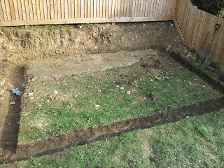 I have set about swinging a pick axe into the walls of the dead flower bed at the back of my new garden, excavating to level the ground for the Studio of Paradise #14, The Shed of Paradise.