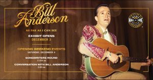 The exhibit traces Anderson’s story from childhood to his days in Georgia, where he excelled as a baseball pitcher and sportswriter while in high school and a disc jockey in college, through his contributions as one of the most decorated recording artists, songwriters and entertainers in history. Bill Anderson: As Far as I Can See opened Friday, Dec. 3, and runs through March 19, 2023.