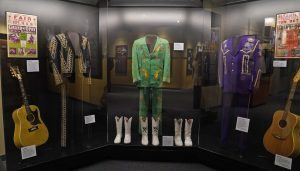 Stage costumes worn by Anderson, including rhinestone-studded suits from the 1960s designed by S.A. Formann, a Buffalo, New York-based tailor, and Nudie’s Rodeo Tailors.