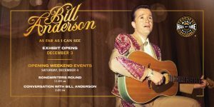 Interview and Performance: Bill Anderson – 2 p.m.Anderson will sit down for a one-on-one interview with the museum’s Peter Cooper. The interview will be illustrated with archival photos, film and recordings related to the exhibit. Anderson will also perform briefly.