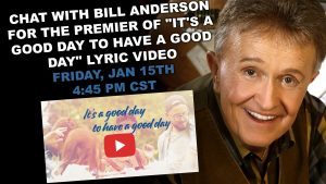 Bill Anderson so excited to get 2020 behind us he thought we could have a good day and chat about it during the premiere of the official Lyric Video of his new song “It’s A Good Day to Have a Good Day”. Bill will be online chatting with everyone right before the premiere on Youtube of the video so feel free to submit your questions to Bill at AskBill@BillAnderson.com ahead of time.
