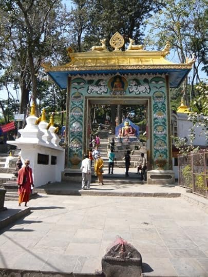 The entrance to Swayambunath. Swayambunath is the main Tibetan Buddhist site of Kathmandu. Sitting on top of a hill overlooking Kathmandu, it comprises temples, stupas and various other buildings, including a couple of Hindu shrines. Here, a Hindu holy man lurks in ambush, ready to dab a tikka mark on the forehead of (especially) western tourists and demand rupees for the privilege.