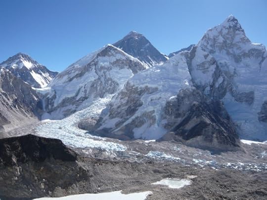 Everest from the summit of Mount Kala Pattar (5545m). In the foreground is the Khumbu Glacier, the summit of Everest is the dark peak against the central skyline, with Everest West Shoulder directly in front and Nuptse (7879m), apparently the tallest peak in the picture, because of the perspective, to the right of them. Changtse (7550m) across the border in Tibet, is to the left. Lhotse (8501m) can be glimpsed to the right of Everest, behind Nuptse.