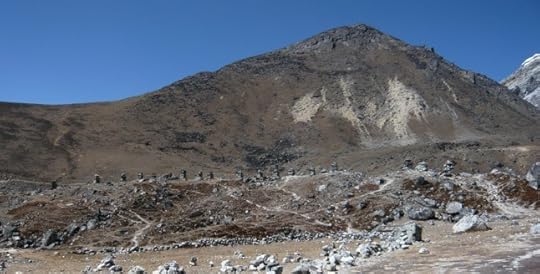 Cairns to climbers who have died on Everest, near Dhugla (Thokla). And a very sobering sight they are, too. Some have plaques, some simple inscriptions, many are anonymous. As you walk further up the Thokla Pass, you look back to this line of cairns on the ridge.