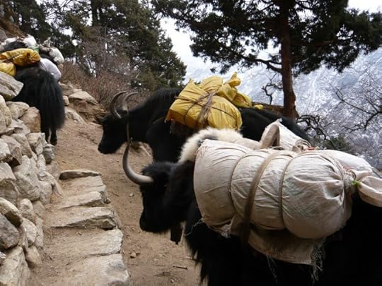 Local transport. A caravan of dzo – a cross between cattle and yaks – pass stone seats provided for travellers. Dzo tend to be both larger and stronger than yaks, an obvious advantage in an animal used for carrying heavy cargoes! They can also go down to lower altitudes than yaks, who are adapted for life at high altitudes.