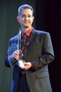 John DeNardo with SF Signal's Hugo Award; photo via Tor.com