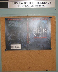 But here's the door (with apologies for crookedness!)—& although I haven't got a name plate yet, just the generic writer-in-residence address, there's that cover flat of The Heir of Night to personalise things a bit, even though it's very early days.