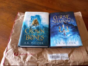 Look what I found in my post office box on Christmas Eve — an initially mysterious parcel stamped “Australia Post” that turned out to contain two beautiful hardback books: Crown of Bones and Curse of Shadows by AK Wilder.
