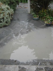 This first one is of sand (it looks like mud but it is sand) and water outside my back door, shortly after the quake–it took about a minute to get from nothing to this. To get an idea of the depth of sand, note the level against the pots.