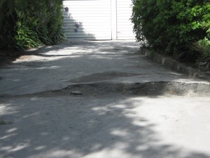 'Re-sculpted' driveway with the major fault running across, but a close look at the garage door reveals that the ground in front is now higher than the base of the door
