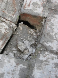 Even more interesting are the sunken bricks in the path. When you peer through the gap you realise that there's nothing there, because all the sub-surface material has been forced out.