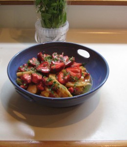 Many of the simplest meals are also the best—and I have found that many of my simplest and best recipes are old, as well: they have come from my grandmother's cookbook, and possibly from her grandmother's before her. Or are recipes that are "traditional" to a particular cultural cuisine–like the combination of oranges and strawberries featured here, or ripe tomato married with fresh basil. (Or, dare I say it, bangers and mash!)
