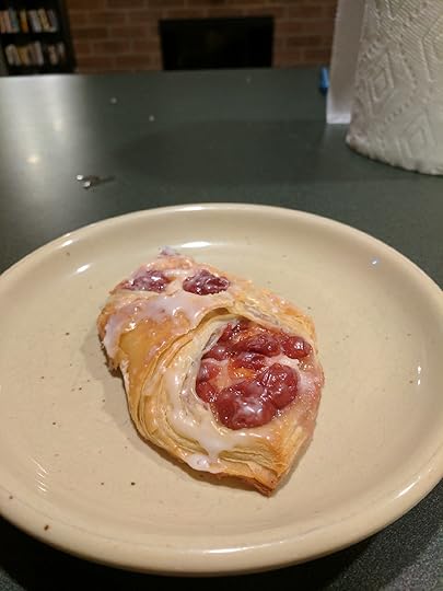 Martin eats a French pastry soon after, and Sean describes the process of making puff pastry by hand. I've studied French pastry, and here's a cherry and cheese Danish made from an 81-layer puff pastry I made from scratch: