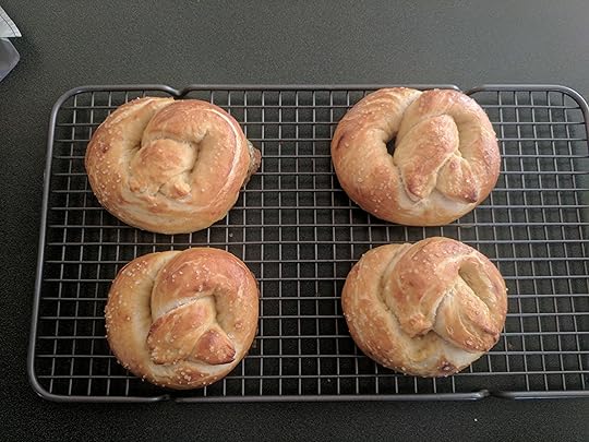 So that happened and was great.As I said last time, I'm training to do well in a half marathon. The official race date is September 30, so it's coming up fast. I was getting a bit of pain in my legs, so I reduced my non-running day exercise. Last time I said I was doing yoga, but I think that was too strenuous on my legs for proper recovery. I'm still doing some light cross training and stretching. The pain is gone, so I really think that was the problem.I don't know if I've said this before, but I'm super into baking---mostly bread, mostly sourdough. I decided to stretch out of my comfort zone and try sourdough pretzels: