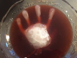 To make an “ice hand,” fill a latex glove with water and freeze. To make the mummy cupcakes, use tube frosting to crisscross chocolate cupcakes and M&Ms for the eyes.