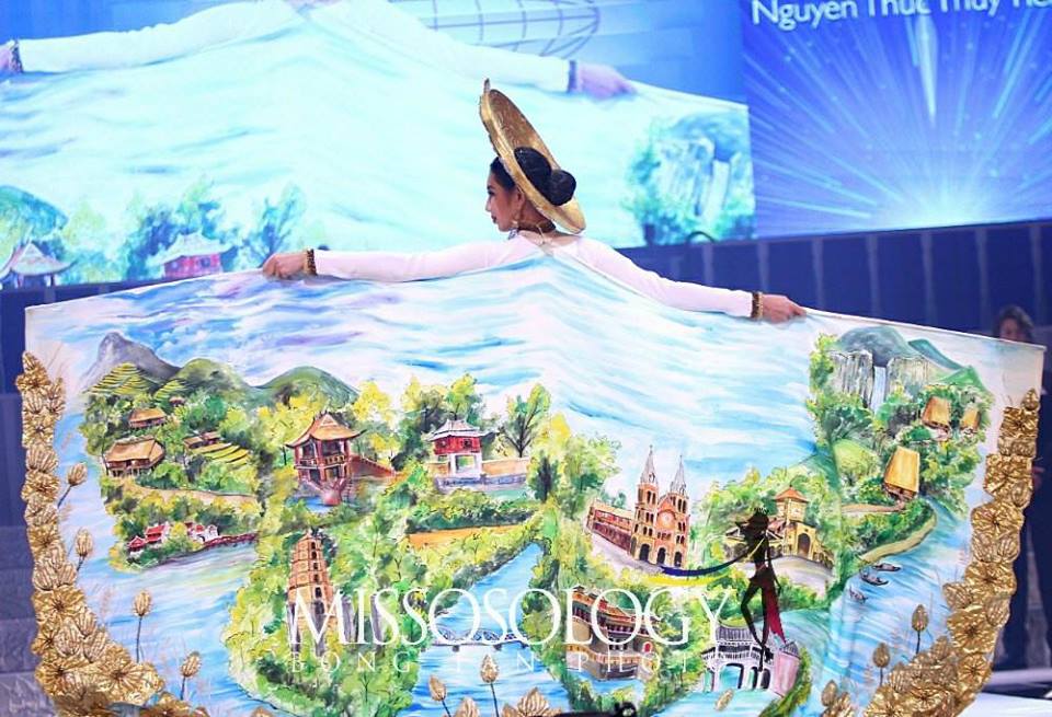 1. Miss Vietnam International Nguyen Thuc Thuy Tien--This was my No. 1 Choice for Best National Costume at the Miss International 2018 Beauty Pageant. I loved the Haute Couture take on the traditional Vietnamese Ao Dai; this one was simply outstanding! The dress itself was fitted to perfection and featured golden flower appliques rising from the hem. The same gold embroidery was then seen in a stunning hand painted cape depicting Vietnamese countryside scenes.And if all of that wasn't enough, the entire look was finished off with a gorgeous straw and crystal headdress/hat. Kudos to the designer for a fabulous National Costume!
