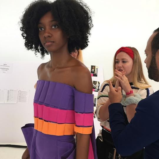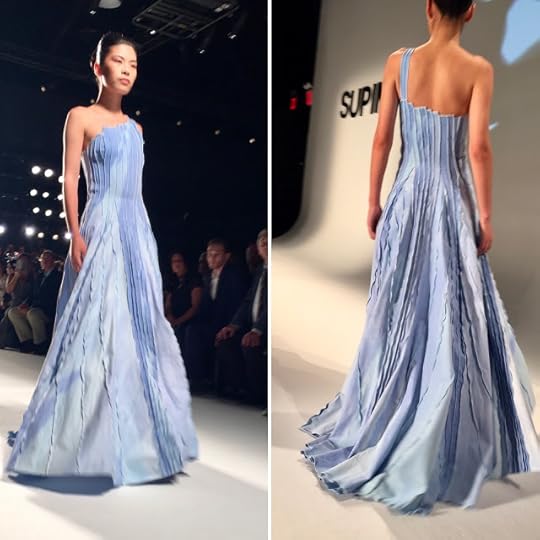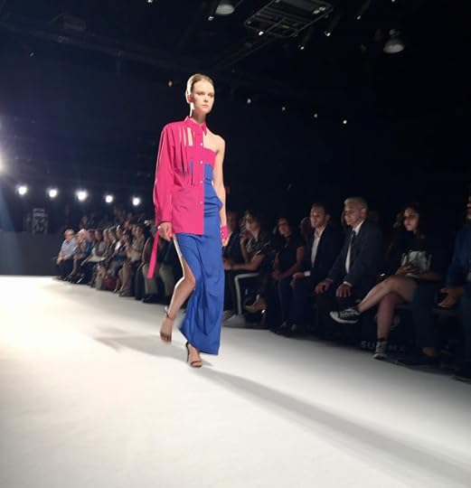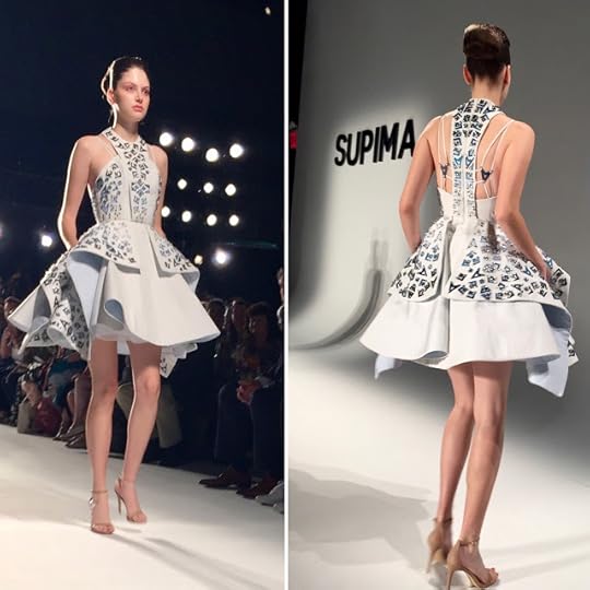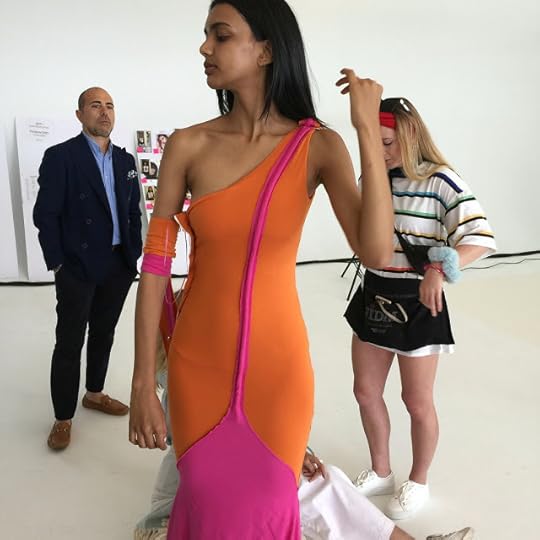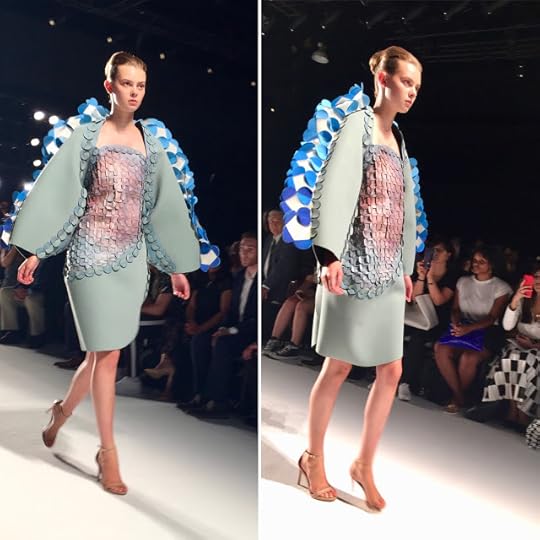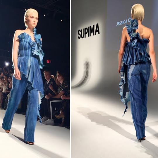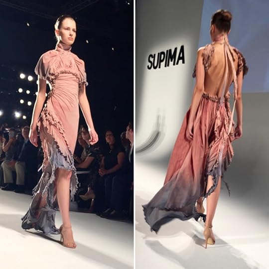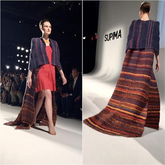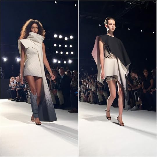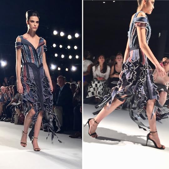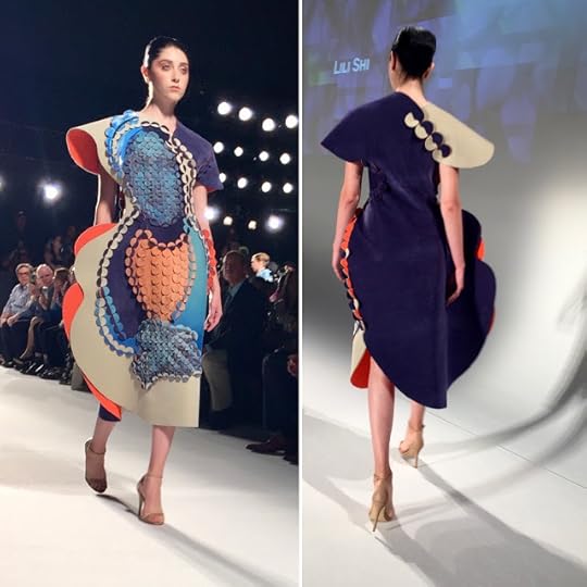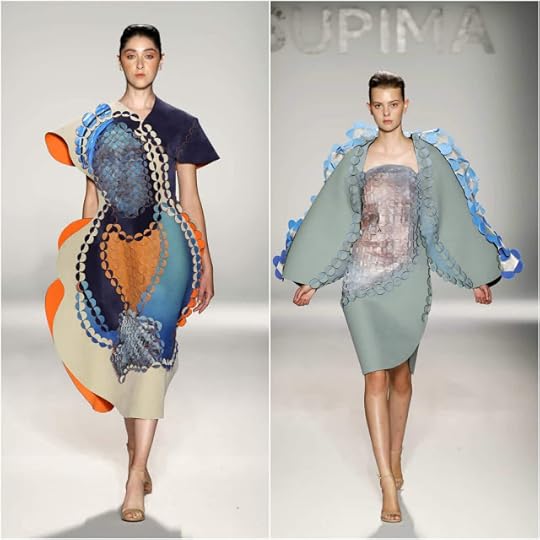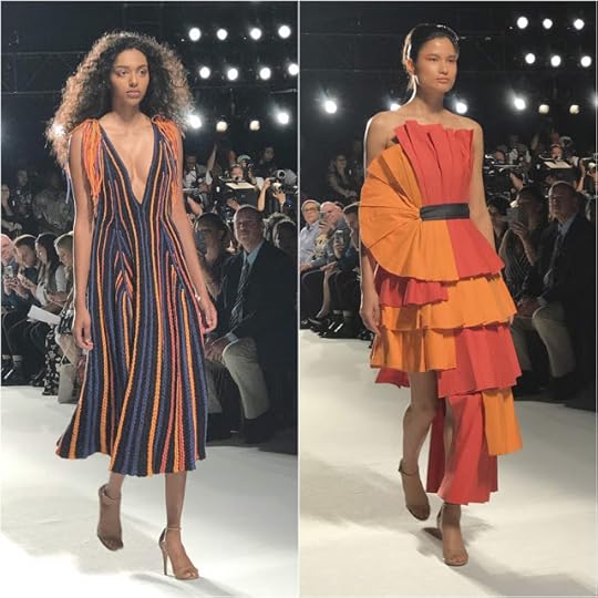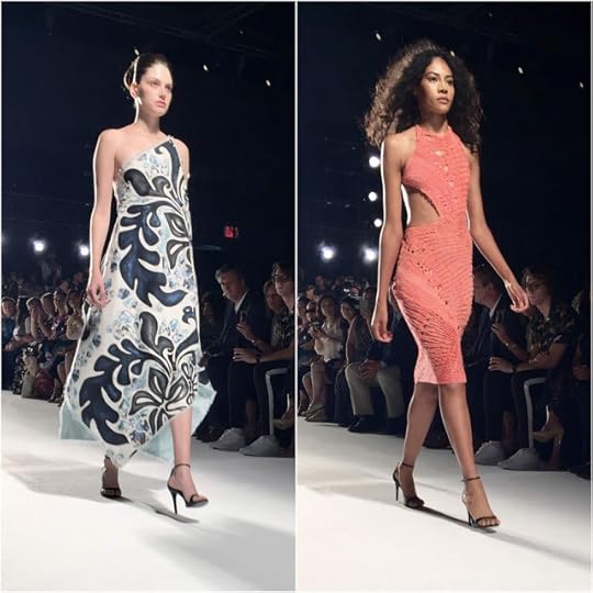 SEEN ON THE RUNWAY: Dresses, jackets, pants...with "quickly sketched" marker-like prints; dresses with fabric bolts attached to dress; models holding fabric bolts.