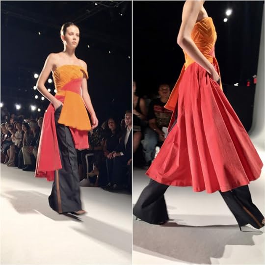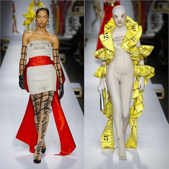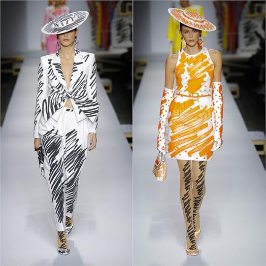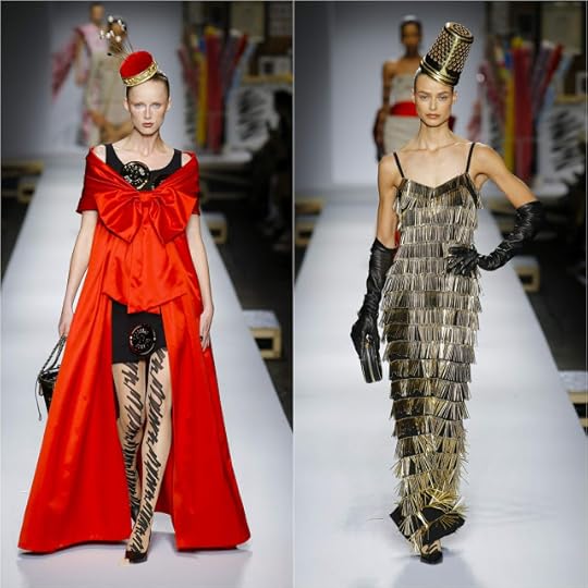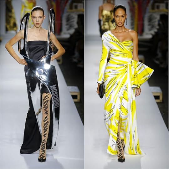 INSPIRATION: Moschino Creative Director Jeremy Scott described the inspiration as based on a "rushed collection" and how designers are pressed for time to churn out collection after collection after collection in very limited times....therefore Jeremy Scott envisioned a "rushed" collection. At the same time, the collection was an homage to the old couturiers--the likes of Yves Saint Laurent, Hubert de Givenchy...