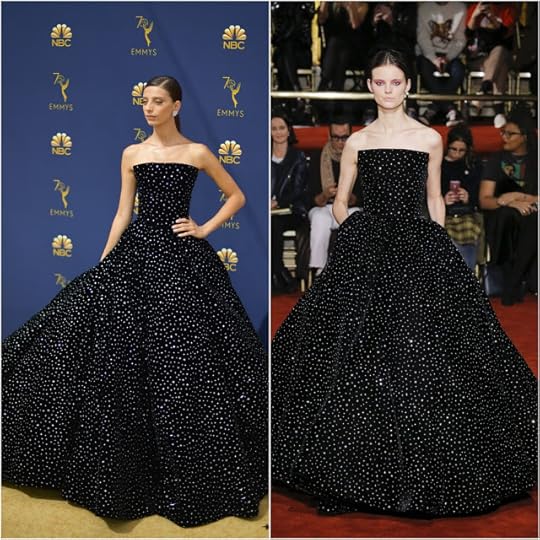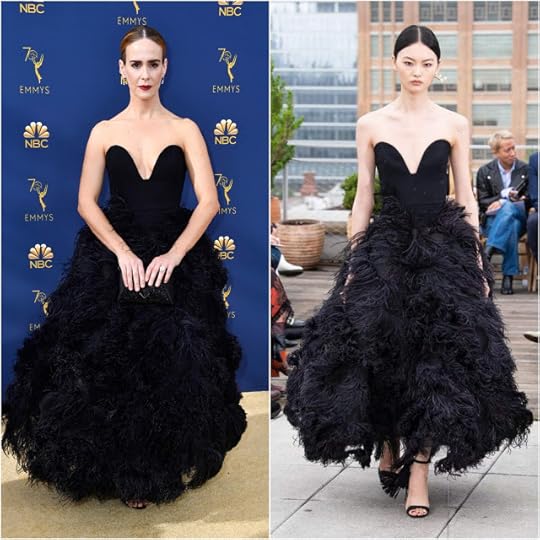 Sarah Paulson in Oscar de la Renta Spring 2019--Sarah Paulson looked stunning in this black strapless gown from Oscar de la Renta Spring 2019. Once again (like Rachel Brosnahan's dress), this came from a collection that was just shown at New York Fashion Week. The dress featured a scooped bustline, fitted bustier and feathered ball-skirt. The design--as you can see on the runway photo on the right--is tea-length, yet on Sarah, it ended up being more to-the-floor (the model is 5' 11" while Paulson is 5' 6"). Sarah Paulson's dramatic center-parted hair style, and strong red lipstick were just right for such an impacting dress. She was styled by Karla Welch .