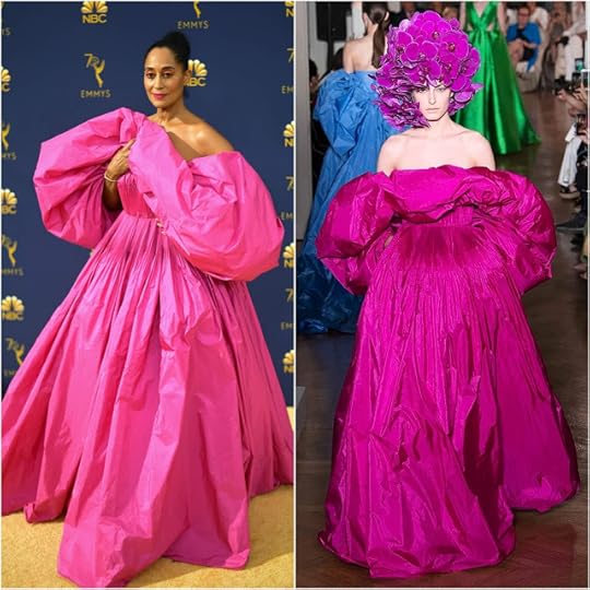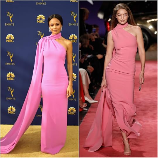 Thandie Newton in Brandon Maxwell Spring 2018--Thandie Netwon in this pink one shoulder draped column gown from Brandon Maxwell Spring 2018 was my second favorite look of the night! Styled by Erin Walsh , Thandie Newton look elegant, super chic and giving me an Elizabeth Taylor-meets-Sofia Loren Alta Moda "Old Hollywood" vibe. Gorgeous.
