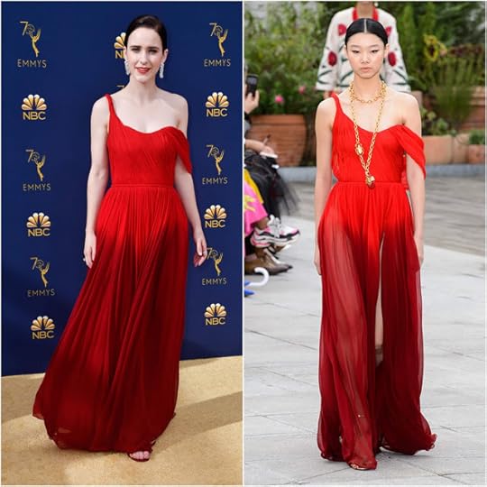 Rachel Brosnahan in Oscar de la Renta Spring 2019--This beautiful red gown was just shown two weeks ago at the Oscar de la Renta Spring 2019 NY Fashion Week show. Designed by Laura Kim and Fernando Garcia, the dip-dyed one shoulder chiffon dress evoked the diaphanous, Goddess look of a 1930's Madame Gres gown. I also thought the lipstick red color (that ombre'd from light to dark) was perfect against Rachel's alabaster skin.
