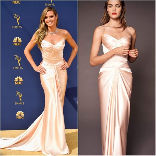 Heidi Klum in Zac Posen Resort 2019--I really loved this Zac Posen-designed dress on Heidi Klum. The strapless gown came from the designer's Resort 2019 collection and featured figure-hugging intricate draping at the bustier and upper torso area, culminating in a slightly full mini-pleated front section. The dusty rose color added a fresh feel to the design, which fit her to perfection.