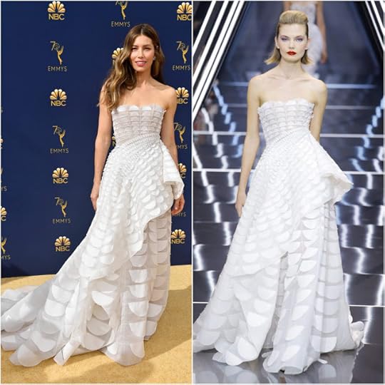 I was VERY happy to see that the red carpet (well, it was actually GOLD) was not a snooze fest and safe, as it has been for many of these top awards shows lately; this year's Emmy Red Carpet was full of outstanding, statement-making designs featuring grand gestures including draping, crystals, bold color and actual (Mon Dieu!) DESIGN! So, without any further delay...here were my TOP FAVORITE LOOKS: