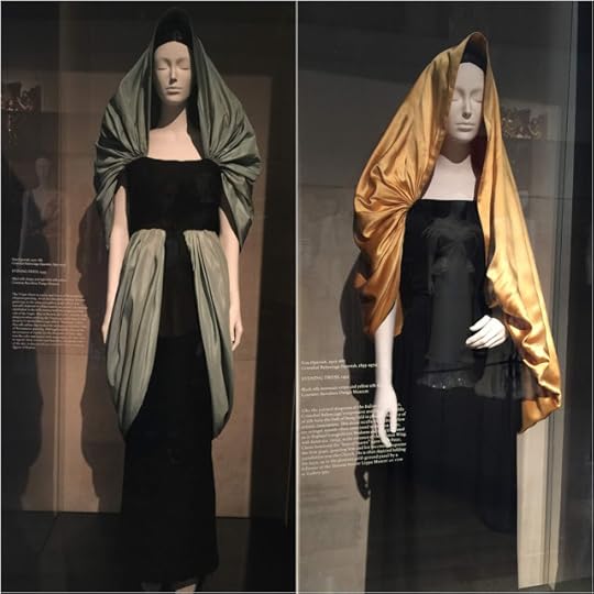Hooded Couture--(L to R) Cristobal Balenciaga black silk cloque and light blue silk taffeta gown, 1949; Cristobal Balenciaga black silk marocain and yellow silk faille gown 1951