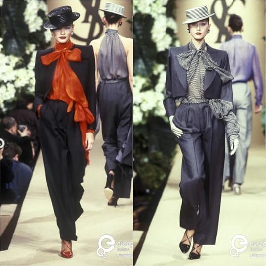 Besides the designs being VERY reminiscent of Yves Saint Laurent's Haute Couture "Glory Days" of the 80's-early 90's (with super strong shoulders, dramatically 80's draped bow-accented dresses, boater hats), even...