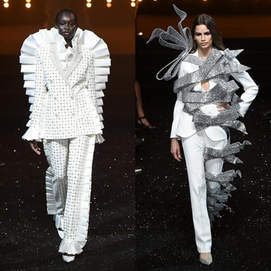INSPIRATION: On their 25th anniversary of being in the fashion world, Viktor Horsting and Rolf Snoeren decided to look back at some of the "Best Hits" from previous collections. This was not nostalgia, however, in that each look got a "refreshner"; while the past designs were there, they were done in different textures, using an all-white color palette and lots of hand sewn Swarovski crystals.