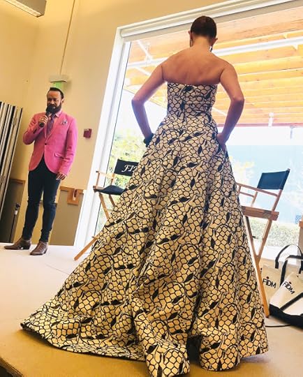 Ballgown Gorgeous--Nick Verreos with model Amanda Fields Bennett wearing his NIKOLAKI Black and White Silk Damask Strapless Ball Gown--FIDM Orange County "3 Days of Fashion" 2018