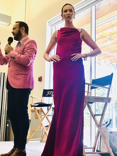 Fuchsia Onstage--Nick Verreos with model Amanda Fields Bennett wearing his NIKOLAKI Fuchsia Colored Silk Crepe-Back Satin Bias-Cut Column Gown with Cowl Drape and Swarovski Crystal Detail--FIDM Orange County "3 Days of Fashion" 2018