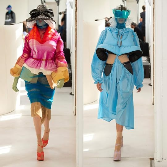 INSPIRATION: Galliano explained in his podcast (you can listen to it HERE) that the collection was the "raw, raw, undiluted essence" of the house. There were overt suggestions of marginalized societies, homeless, migrants, nomadic living..."Survival" clothing, wrapped in plastic...even homages to Edie Beale and her infamous repurposing of skirts (worn upside down) or garments worn back to front.