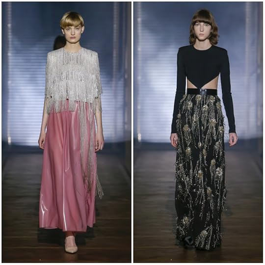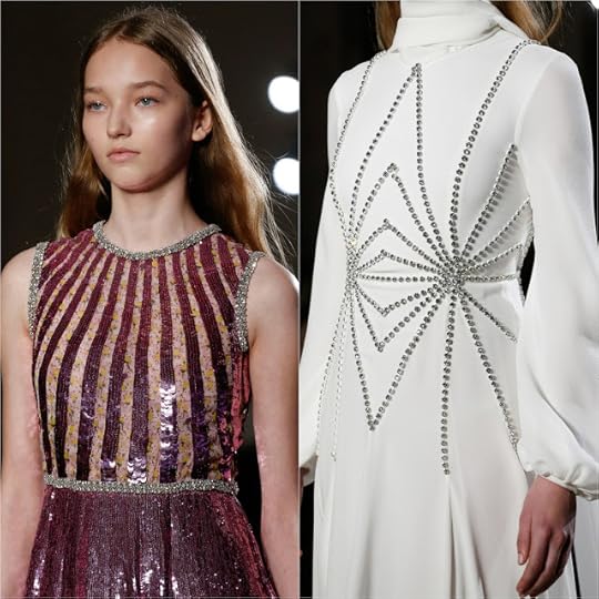 SEEN ON THE RUNWAY: The "Nude Dress" is BACK (it's never been "gone" for Elie Saab, of course)...Party Gowns Galore...Sheer sequined "Goddess Gowns"; incredible sequin/beading, feathers, sequined caps; Art Deco-like beading; silk satin bow accents.