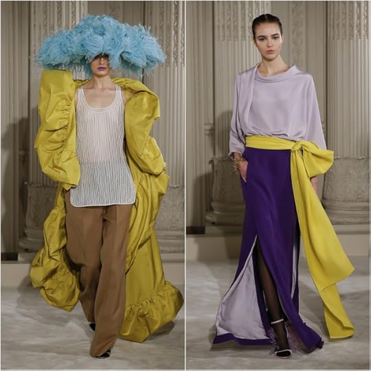 SEEN ON THE RUNWAY: Theatrical ensembles, UBER large feathered Philip Treacy hats, billowing ruffled opera coats, gowns, large bows; gold, blue, plum, vermillion, cerulean blue and pink; hand-sewn silk organza appliques; sequined flowers.