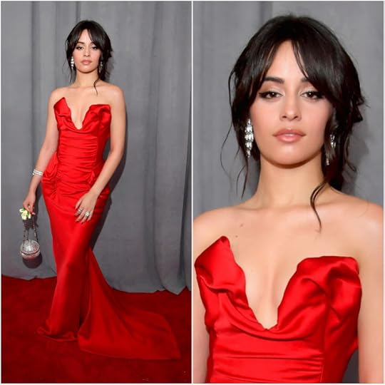 4. Camila Cabello in Custom Vivienne Westwood Couture--Camila Cabello wore a strapless red gown from Vivienne Westwood Couture. The dress featured a draped "sweetheart" neckline, rouched front torso and exaggerated hourglass shape with back train. The gown was VERY Vivienne Westwood and looked great on Camilla. I also loved her upswept hair style and sequined "Disco Ball"-like purse.
