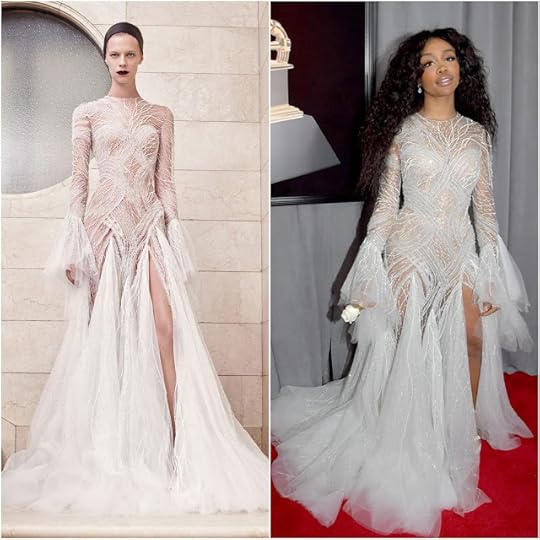 5. Sza in Atelier Versace Fall 2017--You really can't go wrong with a $100,000 costing Atelier Versace gown and Sza (and her stylist) must have realized this when choosing this for the 2018 Grammy Awards. She looked like a "Game of Thrones" Winter Queen in this Atelier Versace Fall/Winter 2017 gown. The ivory sequined (every crystal hand-sewn!) tulle dress was completely see-through and came with a super-constructed boned inner corset-and-panties to help give the sexy shape to the look. A STUNNING dress and definitely entrance-making for the Grammys.