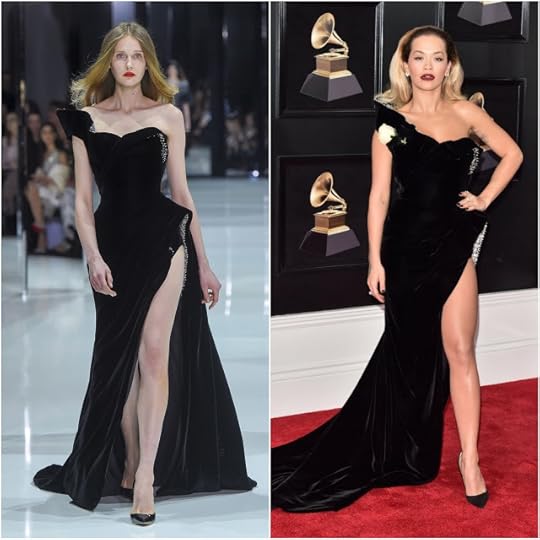 6. Rita Ora in Ralph & Russo Couture Spring 2018--Another 2018 Grammys attendee wearing very, very expensive haute couture was Rita Ora. She looked DIVINE in this strapless black silk velvet gown from British-based duo of Ralph & Russo and their Haute Couture Spring/Summer 2018 collection which was just shown last week in Paris. I loved every inch of this on Ora, especially the super-exposing front slit, showing off her toned leg, as well as the off-the-shoulder stand-up detail with "hidden" crystal applique. The entire look reminded me of an updated version of that famous John Singer Sargent's "Portrait of Madame X":