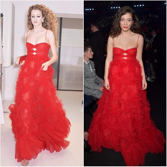 8. Lorde in Valentino Pre-Fall 2018--Lorde wore this BEAUTIFUL red gown from Valentino Pre-Fall 2018 for the 2018 Grammy Awards last night. I loved seeing her in such an ultra feminine style as opposed to her usually darker/moodier looks. The ballgown featured layers upon layers of point d'esprit silk chiffon and tulle and that classic "Valentino" peek-a-boo neckline and in the iconic "Valentino Red". This is a gown one would choose for say, a black-tie bash at the Ritz in Paris but....I love that she wore it to, of all places, the Grammy Awards!