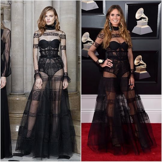 9. Heidi Klum in Ashi Studio Fall 2017--If anyone can work the "nude dress" and see-though trend, it is Fräulein Klum. And work it she did! For the 2018 Grammy Awards, Klum wore this black lace and point d'esprit gown from Beirut Lebanon-based Ashi Studio Fall/Winter 2017 Ready-to-Wear. The see-through dress featured intricate puzzle-like lace pieces, a boned corset and matching panties. I thought this was a perfect choice for Heidi at the Grammy's.