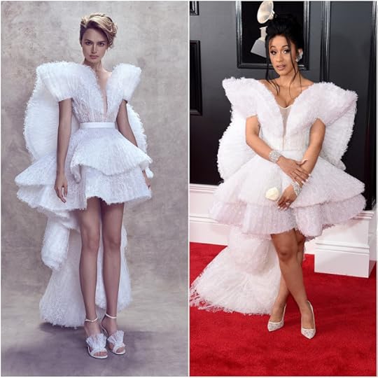10. Cardi B in Ashi Studio Couture Fall/Winter 2017--Now, I know this choice might be a little controversial (from looking at my Instagram post !), but hear me out: I really liked this ivory dress from Lebanon designer Ashi Studio Couture Fall/Winter 2017 (same designer worn by Heidi Klum). I thought the design and that cascading "Angel wing"-like back was very dramatic and impacting. I do, however, realize that Cardi B is very petite (she's 5' 2") and this style of a dress probably would have been better served by a taller gal; it was overwhelming and a bit "heavy" on her. But I love that she took a chance, made a impact and looked like an Angelic Snow Queen.