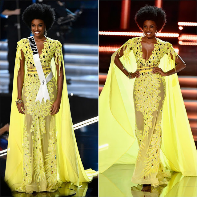 20. Miss Universe Ghana Ruth Quashie: I absolutely LOVED this canary yellow gown worn by Miss Universe Ghana at the Miss Universe 2017 Preliminary Competition. It made such an impact that I had to add it to my TOP 25 BEST PAGEANT GOWNS of 2017! This dress was designed by Pistis Ghana by Kabutey Dzietror  and Sumaiya Mohammed and featured yellow duchesse satin with hand-beaded Kente-style embellishments. I thought the color, style and fit were PERFECT! And the gown made Ruth a stand-out in a sea of Nude/Silver/Gold gowns at the Miss Universe 2017 Preliminaries. I was also VERY HAPPY that she wore the correct shoes and not those platform ones that too many of the contestants wore.