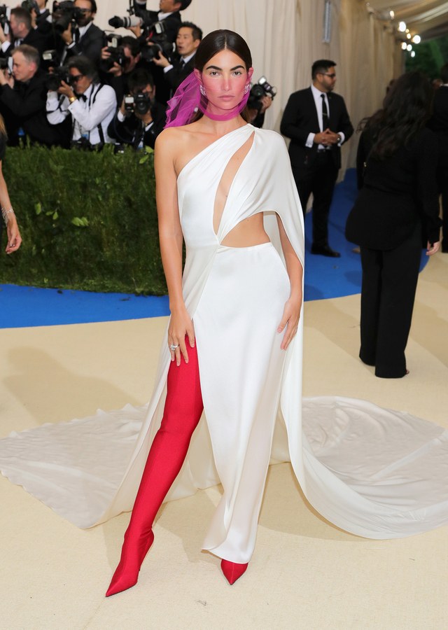 Lily Aldridge in custom Ralph Lauren: Model Lily Aldridge gave her best avant-garde Fashion Diva look at the Met Gala 2017 with this white silk jersey gown with skin-revealing peek-a-boos from---of all brands--Ralph Lauren! This sexy-licious gown has NOTHING to do with Ralph Lauren (seriously was this "Ralph Lauren by Donatella Versace??!!) but I am willing to give it a pass only because she looked AMAZING! That's why I put her in my Best Dressed  and this design in my BEST OF 2017.