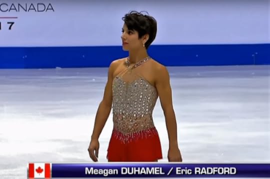 Meagan Duhamel and Eric Radford of Canada: For the 2017-2018 Grand Prix Finals of Figure Skating, Meagan Duhamel changed her costume for her Free Skate to Neutron Star Collision by Matthew Bellamy, I Belong To You (Mon coeur s'ouvre a ta voix) from "Samson and Dalilah" by Camille Saint-Saens, and Uprising by Matthew Bellamy performed by Muse. She wore this sequined gold design that was very much on-trend with the "Nude/Golden" gowns seen on the red carpet as well as beauty pageants. The costume featured beaded gold embroidery over a nude illusion base with a very mini "skirt"...
