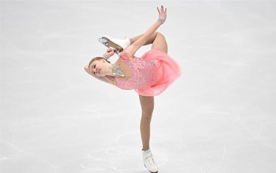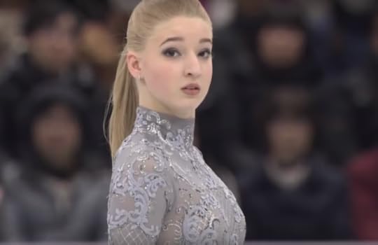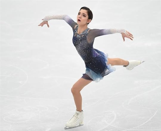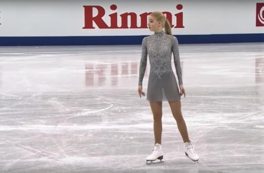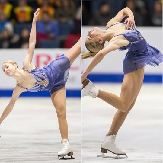 Evgenia Medvedeva of Russia Short Program to Nocturne by Frederic Chopin--For her Short Program, Evgenia has worn this gray, blue and ombre lilac costume throughout this entire 2017-2018 Season. It is a gorgeous costume that reflects the "nocturne", night-lit sky through the design, colors and sprinkle of star-like crystals. I also liked the subtly asymmetrical/handkerchief hem and strappy neckline.