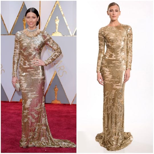 Jessica Biel in KaufmanFranco Pre-Spring 2017: Jessica Biel looked RAVISHING in this golden sequined gown from KaufmanFranco Pre-Spring 2017 Collection at the 2017 Oscars. I loved the simple sheath silhouette, long raglan-seamed sleeves, small train, and especially the "Devore"-like sequined fabrication. In terms of accessories, that Tiffany & Co. necklace was EVERYTHING! I also loved how she styled her hair in that chic center-parted chignon. She looked elegant and regal. Definitely one of the BEST of the Academy Awards and 2017!