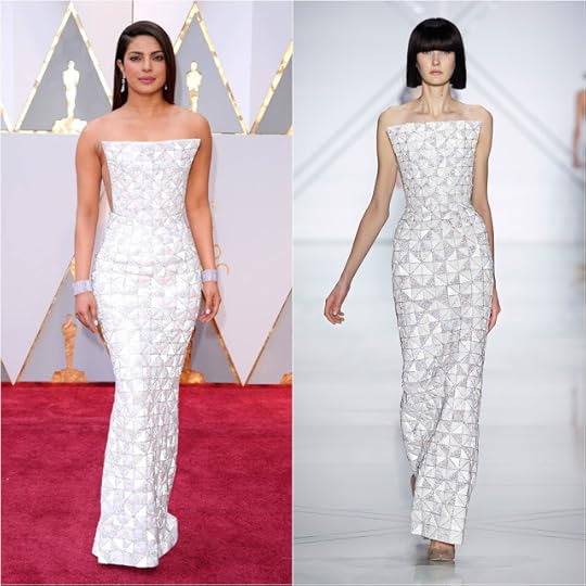 Priyanka Chopra in Ralph & Russo Spring 2017 Couture: Stunning Priyanka went simple and column-like in this Ralph & Russo Couture gown for the 2017 Academy Awards. I thought the ivory color was perfect for her and the long and lean silhouette was clean and modern. I also loved the sequined "blocked" details of the fabric, which by the way, is all hand-done; it's COUTURE darlings! The gown may look simple but if you were to order it, it would set you back an un-simple $80,000+.