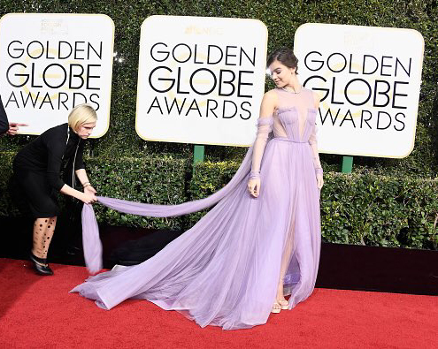 Hailee Steinfeld in Custom Vera Wang: Actress Hailee Steinfeld wore this lilac colored ballgown from designer Vera Wang. The iridescent silk tulle gown was custom-made and featured a full "Princess" skirt, cold shoulder sleeves, gathered details, a center front slit opening...and a back cape/train. Normally, all of those components would probably come out a big ol' Pageant Beauty Queen mess but...here this gown looked ethereal, beautiful and made for a definite red carpet moment worthy of my Best of 2017 List!