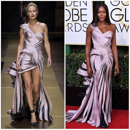 Naomi Campbell in Atelier Versace Fall 2016: Only the one-and-only Naomi Campbell would show up to the Golden Globes SERVING YOU Diva Supermodel Style since after all, she IS a SUPERMODEL! Campbell wore this lilac and black colored silk duchesse satin gown from Atelier Versace Fall/Winter 2016 Couture collection. This $100,000 costing gown (if one were too actually order it and buy it!), featured a one shoulder neckline, bias-cut twisted bands, hand-sewn sequin encrusted panels and dramatic cascade draped back, and Naomi SERVED IT TO Y'ALL! One of the Best of 2017 Red Carpet Looks from the 2017 Golden Globes. Model Diva.
